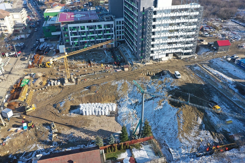 Parkingul și Ambulatoriul Spitalului Județean la faza piloților finalizați și armarea radierului. Urmează forajul pentru ancorare și consolidarea versantului